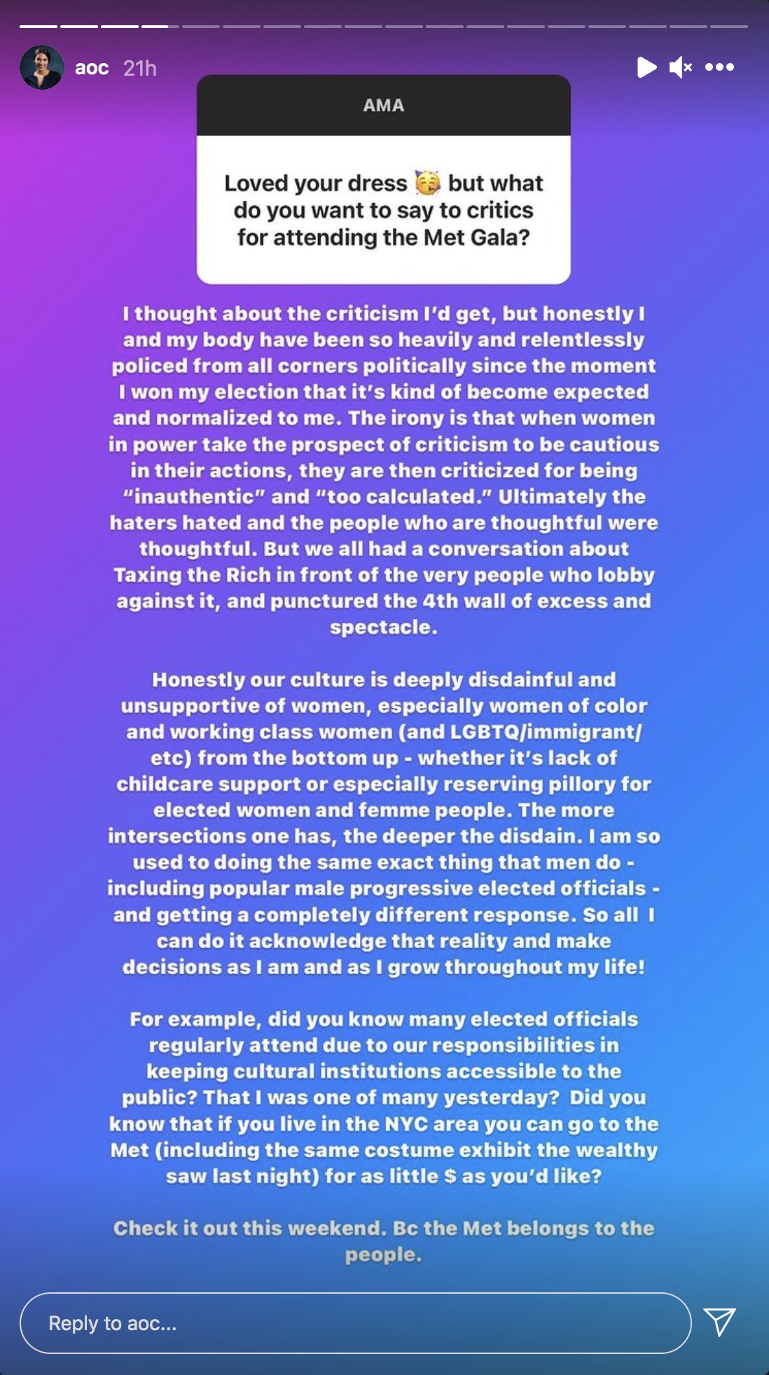 Alexandria Ocasio-Cortez D-NY sparked class warfare dialogue while wearing a pointed message to Americans at the 2021 Met Gala. Aoc wearing the words tax the rich on her dress. Has legions of unpaid interns.